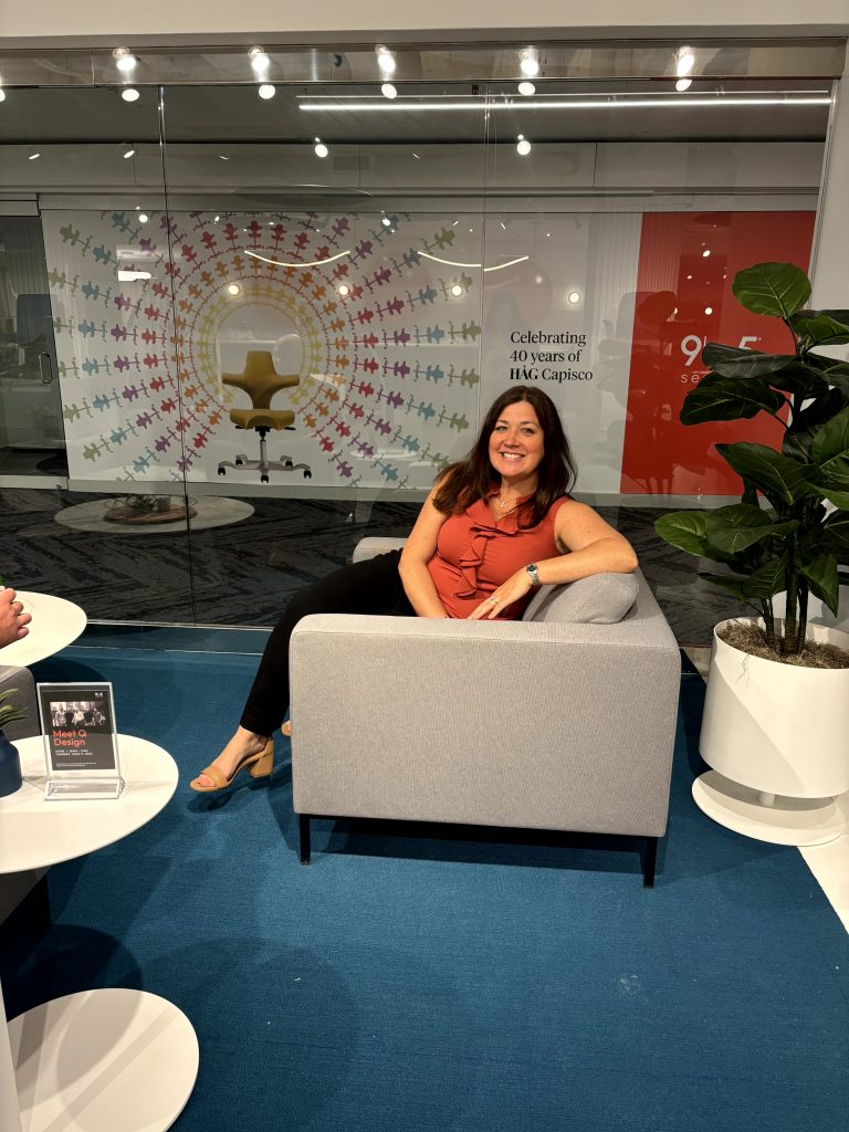 Our showroom update was a hit, featuring neutral colors and vibrant upholstery textures that showcased our new branding. The standout feature was a mural wall adorned with HÅG Capisco backs – a perfect spot for selfies, celebrating HÅG Capisco’s 40th anniversary. Our showroom window graphic across the way also paid homage to this milestone.