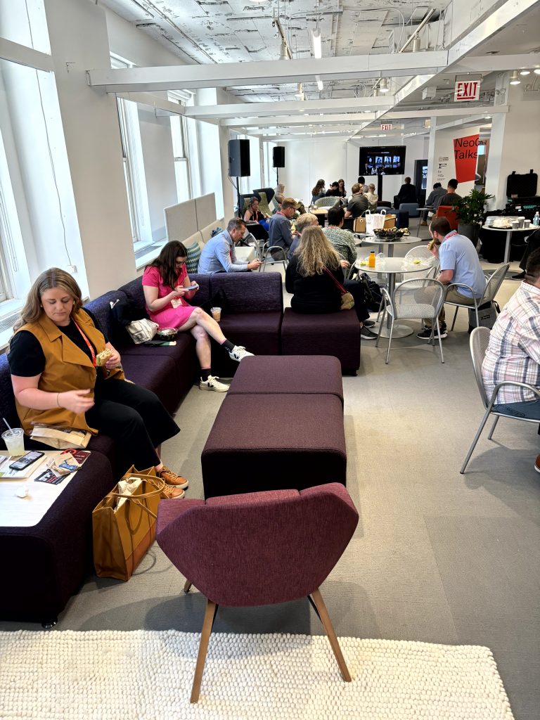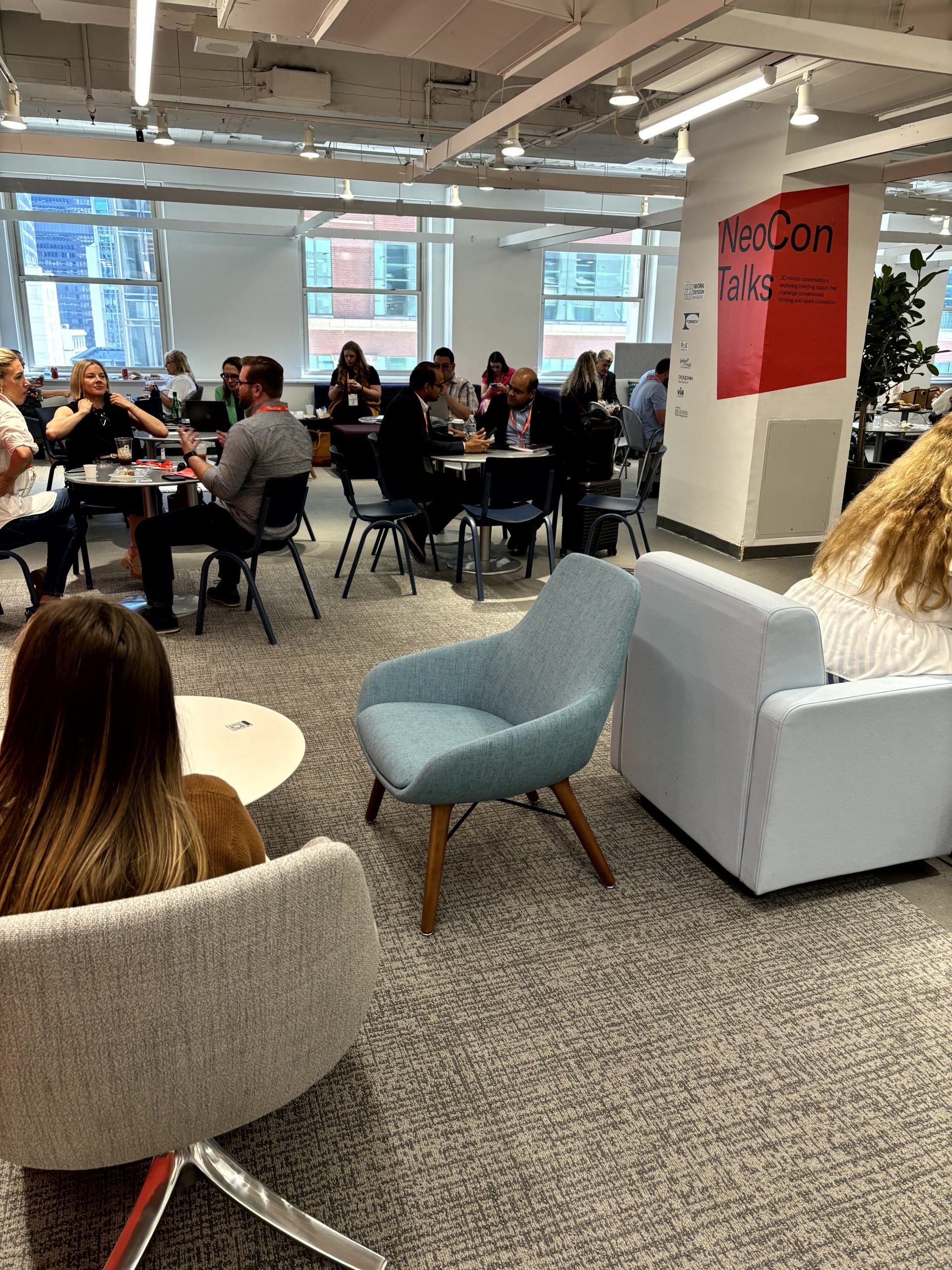 For the first time, 9to5 Seating sponsored NeoCon Talks, a panel discussion series on the 7th floor. This sponsorship allowed us to showcase our chairs in the NeoCon Talks café, where hundreds of attendees relaxed and mingled. Our Koble modular seating, Lilly, Jax, and HÅG Celi were all part of this comfortable setup.