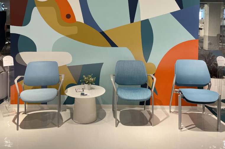 Also, this year, 9to5 Seating added two new murals to the showroom – one facing the hallway and one facing the inside of the showroom. The mural elegantly brings together the color palette of the entire showroom. We were honored to have Liz Flores, a talented Chicago local, breathe more life into the 9to5 Seating space. If you look carefully, you can see the outline of the HÅG Capisco and Lilly chairs. This beautiful new addition to the showroom, along with the new products really speaks to this year’s NeoCon tagline: “Design Makes a Statement.”